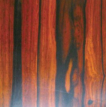 目前,市场上来自东南亚的红酸枝心材有深有浅,材色一般偏红和偏褐。偏红的多呈红中带褐,带明显黑色条纹,即所说的黑筋,密度重。偏褐的多呈褐中带暗红,常带黑褐或栗褐色细条纹,也就是市场上常说的青筋。