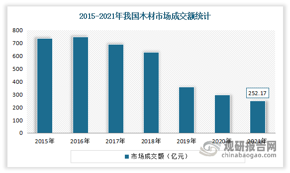 近几年正在大影响下,木材市场需求不旺,使得我国木材市场成交额不竭萎缩。按照数据显示,2021年我国木材市场成交额为252。17亿元,较2020年削减了42。95亿元,同比下降14。55%。