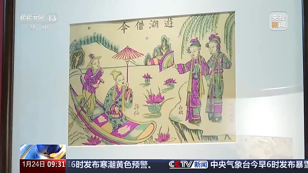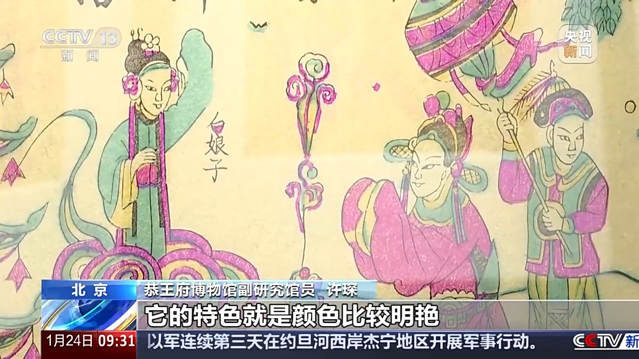 恭王府博物馆副研究馆员 许琛:连系本年乙巳蛇年特地拿出来馆藏的《白蛇传》年画,这也是陕西凤翔戏出年画的一个代表做品,它的特色就是颜色比力明艳。明艳,专家引见,其制做时,先印墨线版,印出年画的轮廓,然后一色一版、层层上色,最终将一幅年画印制完成。这一过程,切确性至关主要。