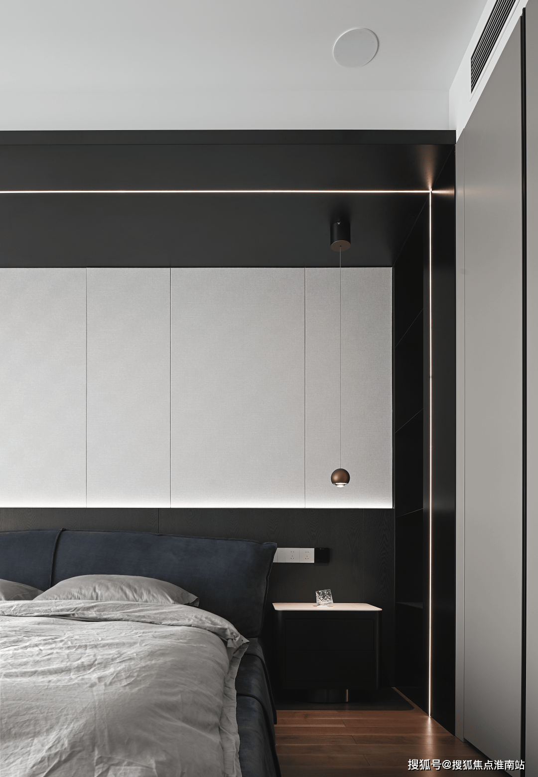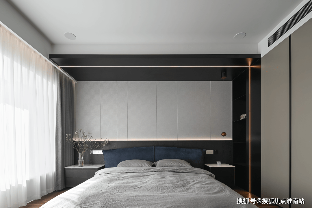 口角两色描画的空间而安静,木质和皮质展示出睡眠空间舒服的一面。无论是视觉仍是触感,都让人沉浸正在平稳的情感里。