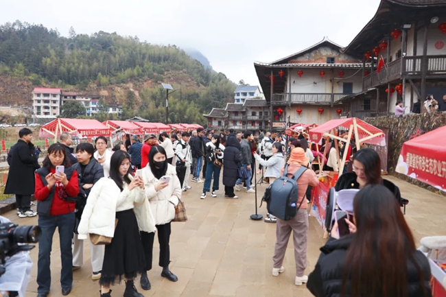 天马村古厝内,葫芦丝吹奏、乐器合奏、戏曲等表演轮流上演,配合驱逐新春到来。金沙薏米、桔柚、钟山大米、沉喷鼻手串、木成品摆件等产物包罗万象。
